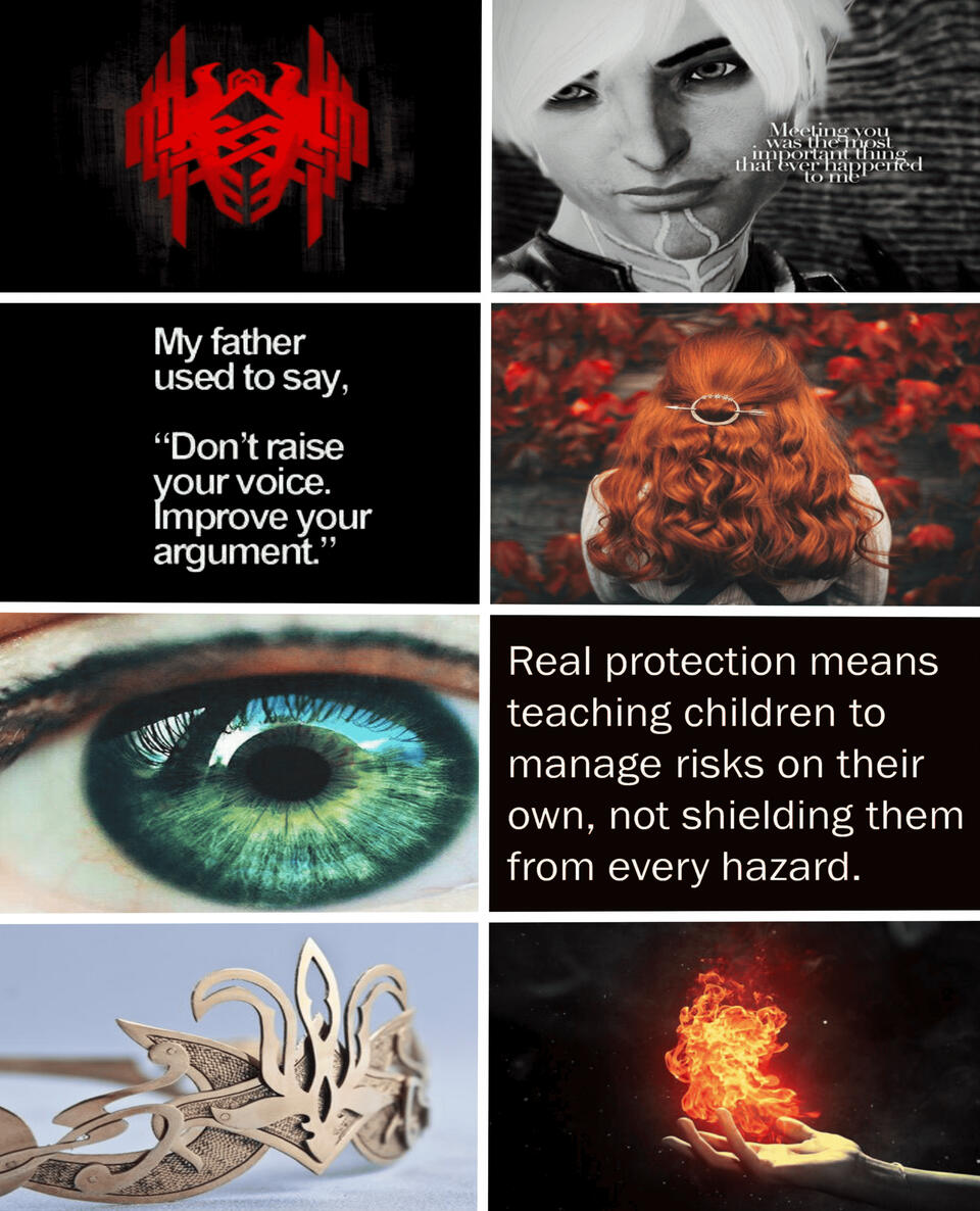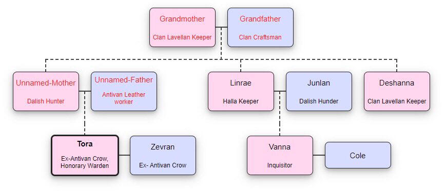 Children: Talsen- male human, adopted estimated to be 14. Calien- male elf, Zev and her bio son named after Calien the hero from the 4th Blight who was also a Crow.